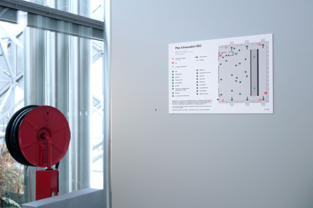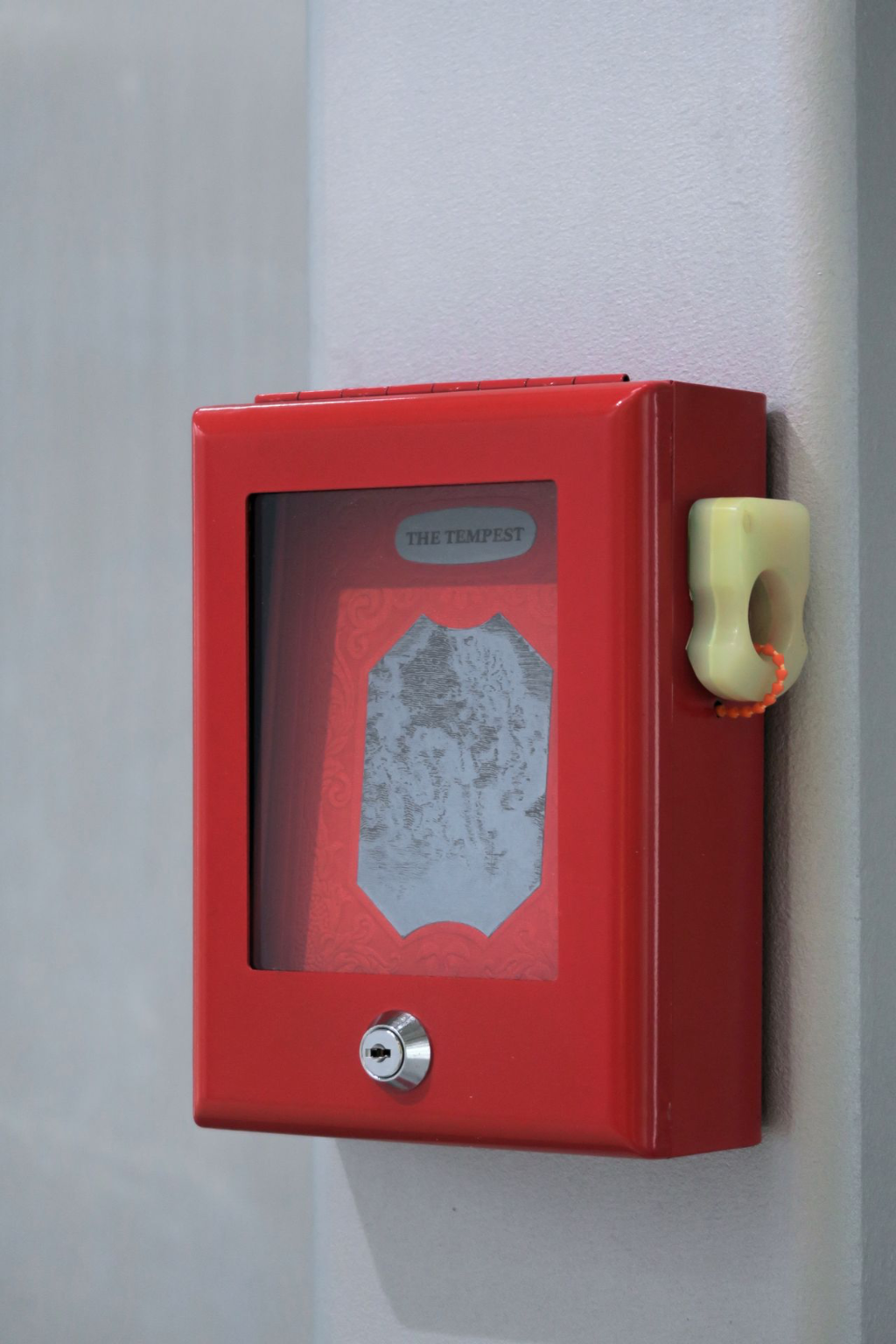 Je me suis intéressé au livre comme arme, à la bibliothèque comme arsenal. Dans la médiathèque j’ai alors remarqué d’autres outils d’action : les dispositifs de sécurité incendie. Ces objets, dont on s’empare en cas de crise, constituent de fait des remèdes. À une époque où les mots et les idées semblent de plus en plus menacés, il devient nécessaire de réinventer les dispositifs qui les défendent.