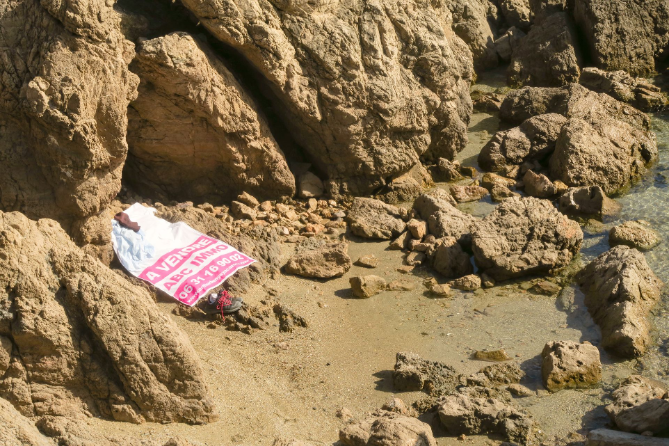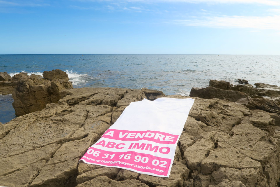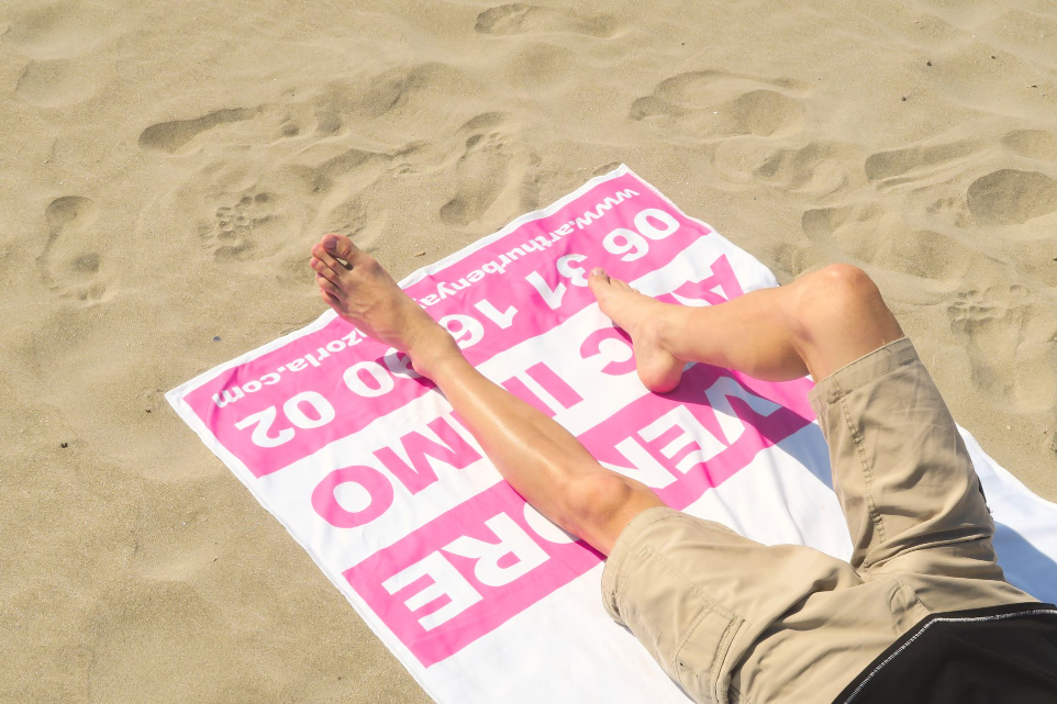 Cette serviette de plage, reprenant l’esthétique des panneaux immobiliers, brouille les codes tout en tentant de perturber le marché immobilier local.